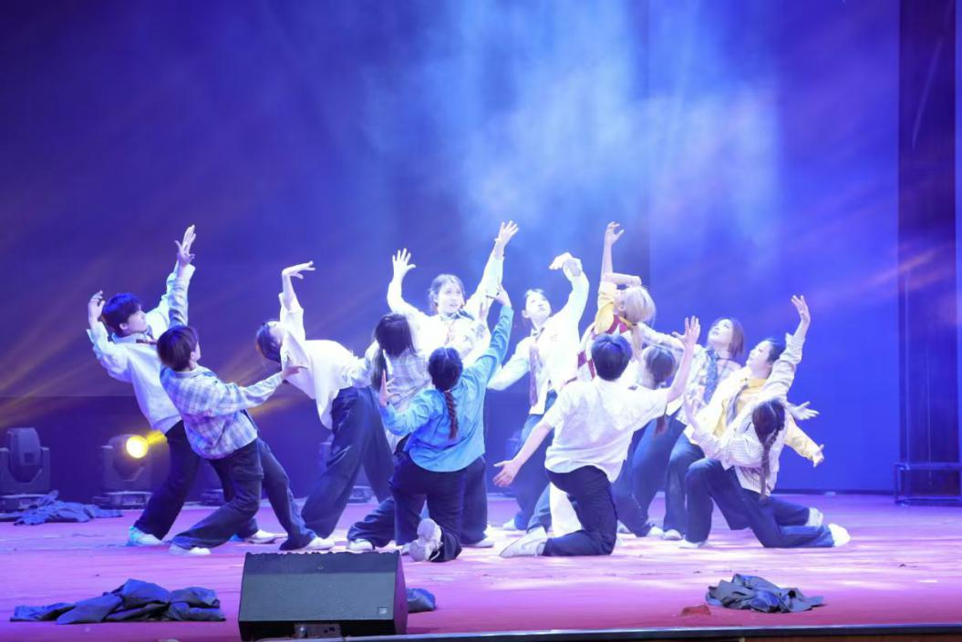 DTB街舞社还参与了学校的五四晚会,他们的表演节目《早安午安晚安》是一支充满活力和创意的舞蹈,其编舞灵感部分来源于北京理工大学在高校耐克街舞比赛中的优秀作品。社长杨斯婷说:“舞蹈的背景音乐和动作设计融入了电影《楚门的世界》的元素,这是舞社尝试的新风格舞蹈。”在该舞蹈中,让杨斯婷印象最深刻的是中间大家举起灯往前走和最后脱下灰色西装的部分,那一刻舞蹈中的演员不再是舞台剧情设定里的NPC,而是拥有彩色人生的鲜活的人。“举起灯往前走意味着我们正用灯去探索那个乌黑的、未知的世界。而脱掉灰色西装意味着我们已经找到自我,去到了五彩的世界。”杨斯婷说道。他们的舞蹈动作整齐划一,充满力量和美感,不仅赢得了观众的认可,也展现了他们作为校园文化使者的精神风貌和团队协作的力量。