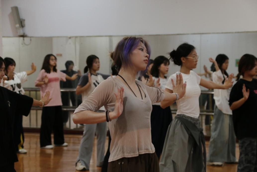 韩玥桐表示:“实际的训练是让我感到挺意外的。一方面,体能训练的强度超出了我的预期,让我意识到需要努力适应;另一方面,训练内容也与我设想的不同,进入社团后直接进入了更具挑战性的编舞学习阶段。”她提到,近期的训练对于体力消耗大,在进行了基础教学的同时,更侧重舞蹈的连贯性训练,对于刚入社的韩玥桐来说,这是一个必须要面对的挑战。但她并没有退缩,自觉增加训练时长,不断复盘,反复琢磨舞蹈中每一个动作。舞社的学姐们看到韩玥桐在背后的努力,一边鼓励一边帮助她去分解复杂的舞蹈,一个动作一个动作地纠正,一个节拍一个节拍地调整。在日复一日的训练中,韩玥桐跟上复杂舞蹈的节奏,也学习到大量舞蹈连贯动作的技巧。