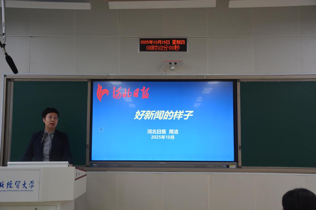 10月16日上午,新闻与文化传播学院邀请河北日报石家庄分社副社长周洁在B教308教室开展主题为“好新闻的样子”的讲座,新闻传播学专业60余名学生参加。