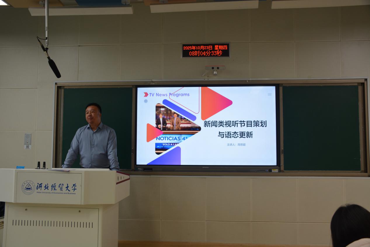 10月23日上午,新闻与文化传播学院邀请河北广播电视台经济生活频道副总监周思超在B教308教室开展主题为“新闻类视听节目策划与语态更新”的讲座,新闻传播学专业60余名学生参加。