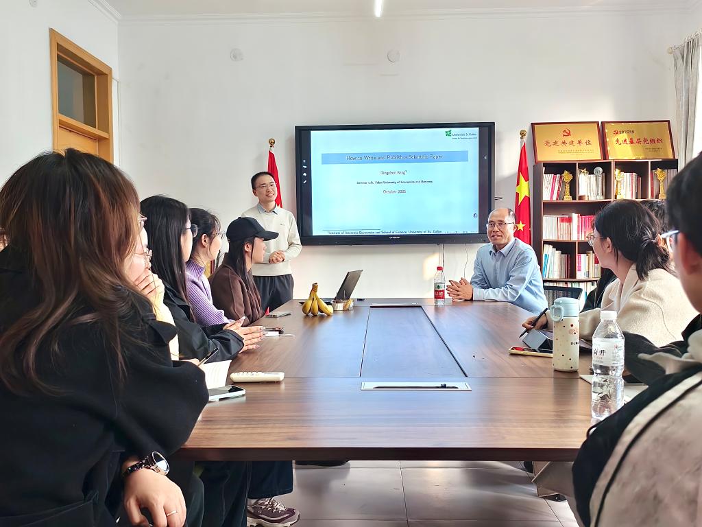 10月31日,金融学院研究生在第三办公楼党务会议室举办第六十三期融道论坛。本期论坛以“英文论文写作与发表经验分享”为主题,金融学院副院长范庆祝主持,特邀瑞士圣加仑大学金融学院博士研究生宁定宸担任主讲人,二十余名研究生参与交流。
