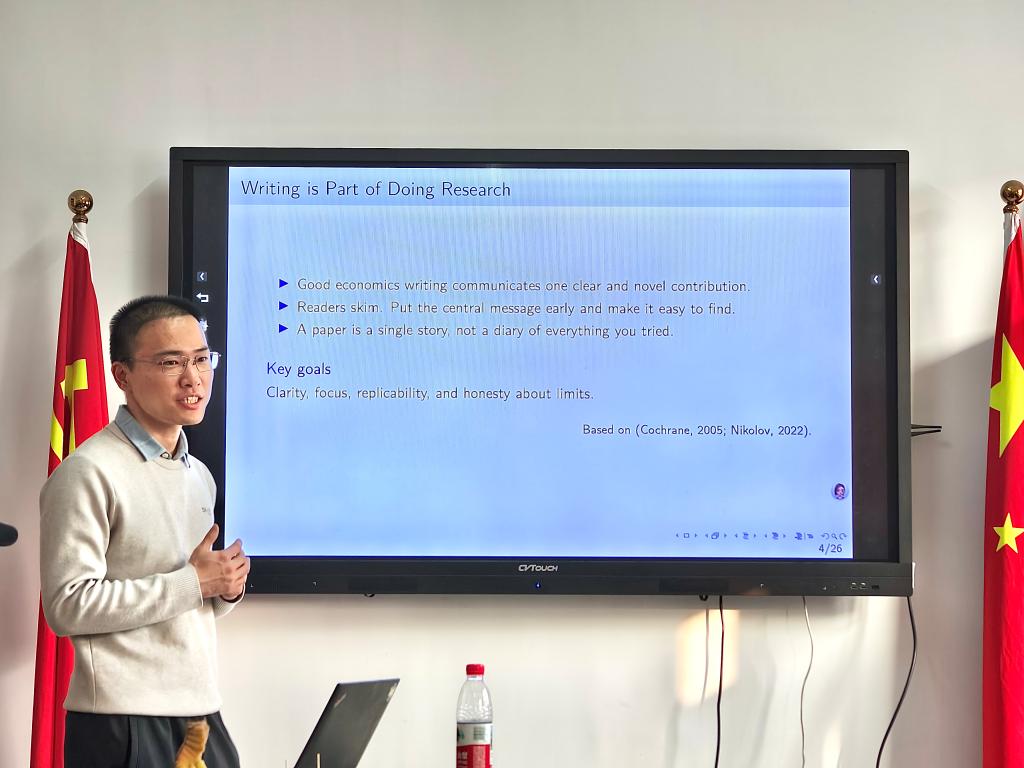 宁定宸结合自身在保险经济学、网络风险管理等领域的研究经历,围绕英文论文的写作逻辑、结构安排、写作风格、投稿策略以及回复审稿意见等方面展开系统讲解。他强调,写作是研究的重要组成部分,要清晰突出论文的新颖贡献,并在摘要和引言部分尽早呈现核心内容。此外,他还就中英文论文的差异、AI辅助写作的有效使用等热点问题与同学们进行了深入交流。