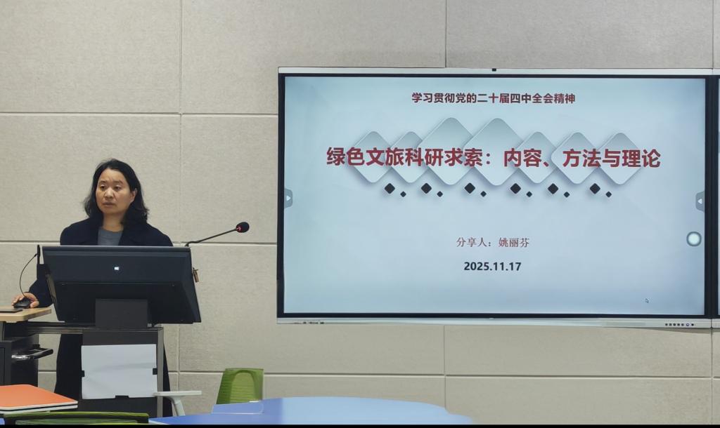 11月17日,旅游学院在206教室举办“双百论坛”,姚丽芬副教授作题为“绿色文旅科研求索:内容、方法与理论”的学术分享。本次活动旨在引导全体教师将党的最新理论精神融入科研实践与教学改革,扎实推进学院内涵式发展。学院全体教师参加了本次学习。