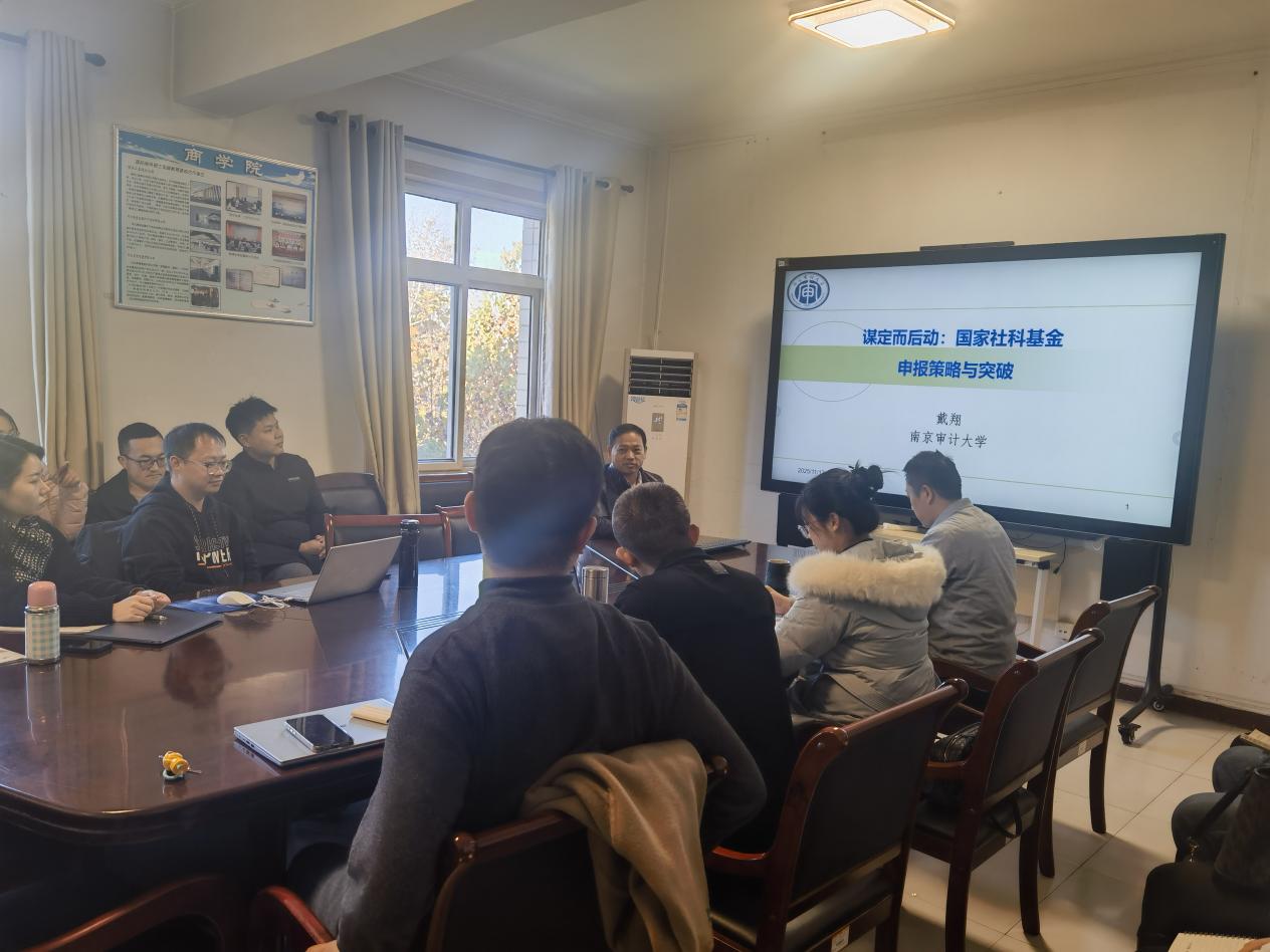 戴翔教授以“谋定而后动:国家社科基金申报的策略与突破”为题展开报告。他认为,国家社科基金申报是系统战略工程,成败关键在申报前“谋定”。当前很多申请者“重写轻谋”,即便有研究基础也难脱颖而出。他强调,真正的“谋定”有三大核心策略:一是选题追求“顶天立地”,对接国家需求与立足自身积累、地域特色找契合点;二是视角力求“一剑封喉”,以真问题为导向提炼具体创新点;三是定位做到“知己知彼”,评估自身优势、预判评审趋势精准发力。“谋定”后再“行动”,撰写申请书要将战略转化为有说服力的文本,用严谨逻辑构建内容骨架,用具体语言阐述创新,把重难点转化为亮点。