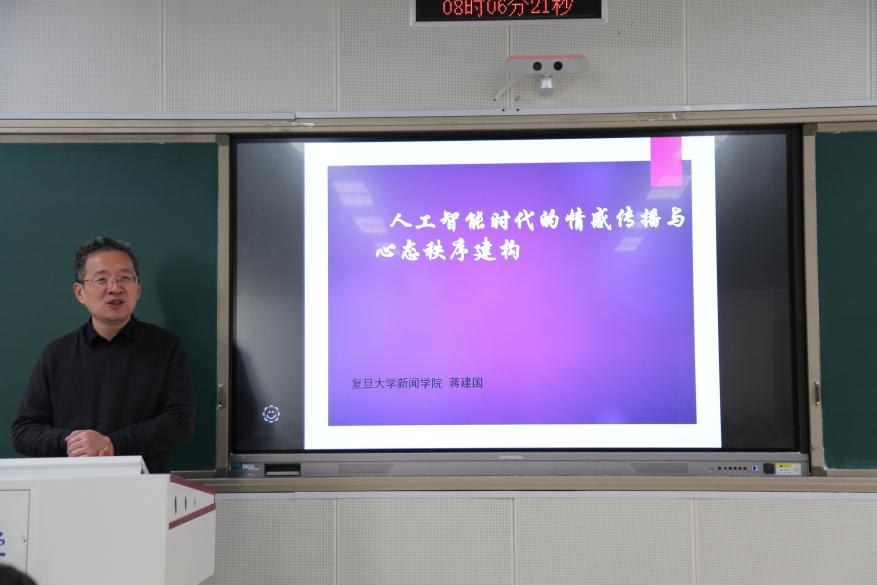 11月27日上午,新闻与文化传播学院主办的新闻与传播理论前沿论坛第10讲在B教308教室举行。复旦大学新闻学院蒋建国教授应邀作题为“人工智能时代的情感传播与社会心态秩序建构”的学术讲座,新闻传播学相关专业师生共60余人参加。