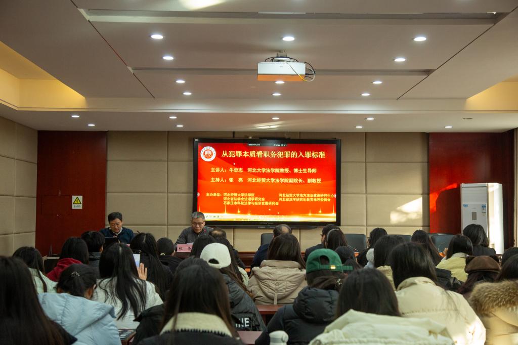 12月20日,法学院邀请河北大学法学院博士生导师牛忠志教授,以“从犯罪本质看职务犯罪的入罪标准”为题作学术报告,我校法学院副教授赵东、法学博士高国其作为与谈人参与交流。报告由法学院副院长张亮主持,80余名学生到场聆听。
