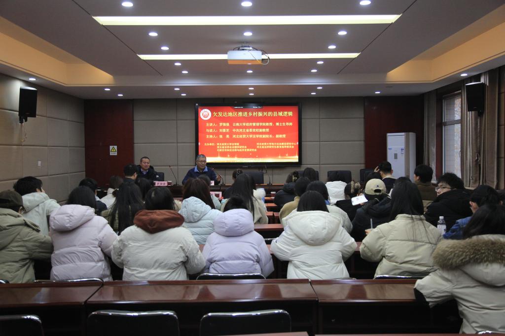 12月19日,法学院邀请云南大学政府管理学院博士生导师罗强强教授,以“欠发达地区推进乡村振兴的县城逻辑——基于‘资源—参与—认同—创新’”为题作学术报告,中共河北省委党校副教授刘景芝、我校法学院副教授林群丰作为与谈人参与交流。报告由法学院副院长张亮主持,法学院80余名学生到场聆听。