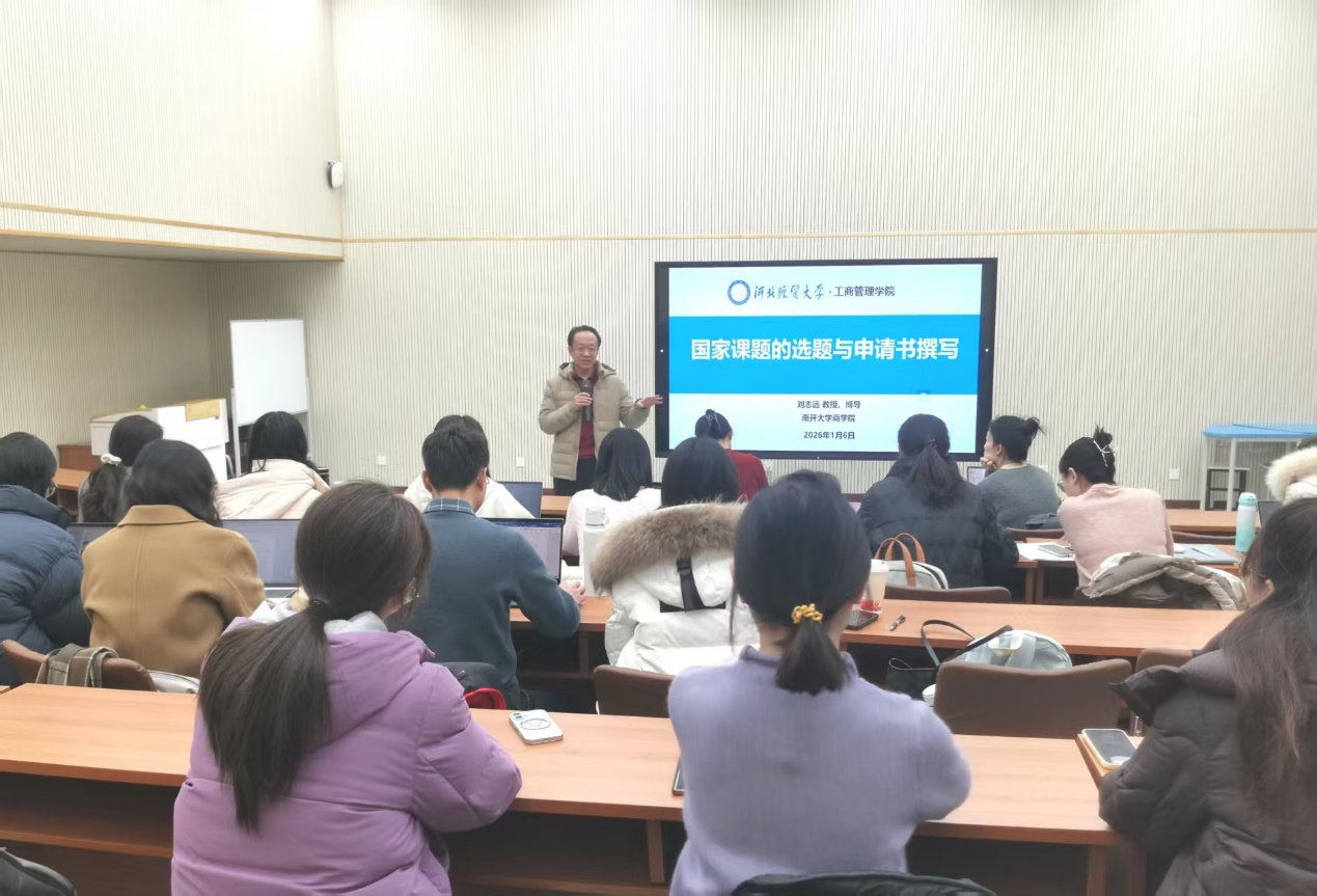 1月6日,工商管理学院邀请南开大学刘志远教授于MBA一教室作题为“国家课题的选题与申请书撰写”的专题报告。报告由工商管理学院院长李桂荣教授主持,学院青年博士教师参加会议。