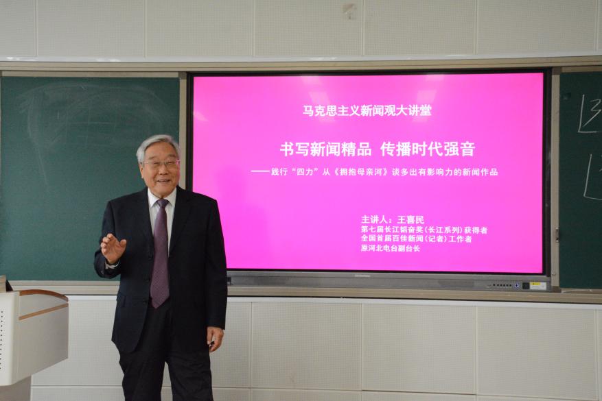3月26日上午,新闻与文化传播学院主办的马克思主义新闻观大讲堂第10讲在第三教学楼A503教室举行。原河北人民广播电台副台长王喜民应邀作题为“书写新闻精品 传播时代强音”的学术讲座,相关专业教师和学生共100余人参加。
