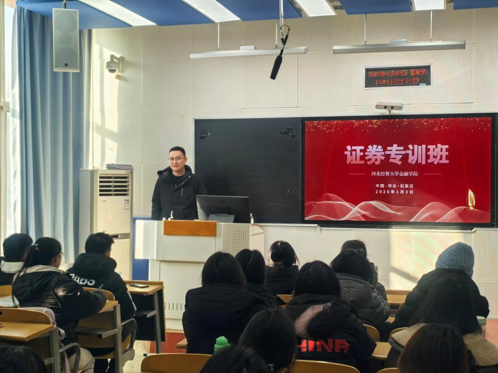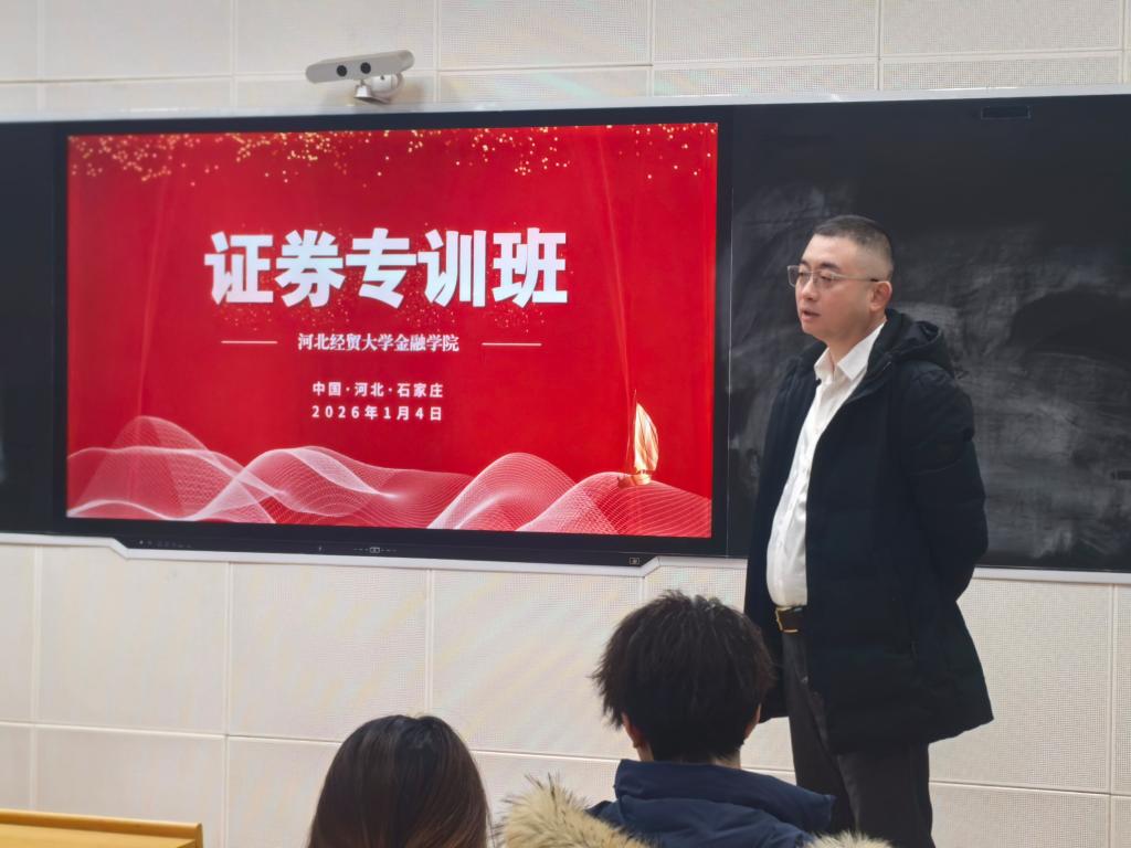 1月3日,河北经贸大学证券期货实训班正式开班。永安期货股份有限公司石家庄分公司总经理王吉元、长城证券股份有限公司石家庄红旗大街证券营业部总经理助理闫红亮、河北岭石网络科技有限公司董事长邢本广、星月泓华私募基金总经理邢文豪出席,金融学院教师代表和实训班学员参加开班仪式,金融学院副院长窦丽琛出席仪式并致辞。