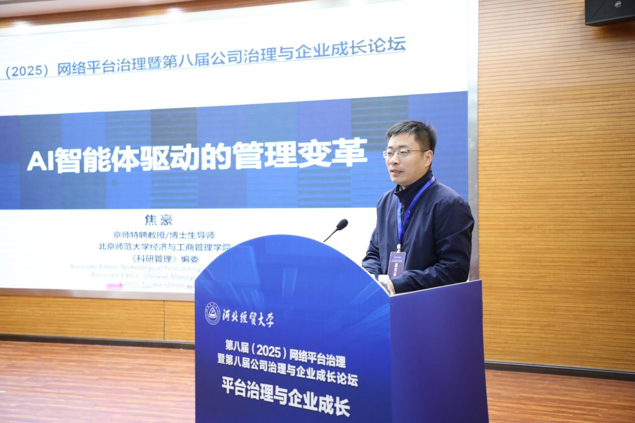 北京师范大学经济与工商管理学院焦豪教授作题为“AI智能体驱动的管理变革”的主题报告。焦豪教授首先系统分析了工业经济、数字经济、人工智能三个时代的竞争优势逻辑演变,结合平台企业案例及相关学术研究成果,阐释了AI智能体对网络效应的延伸作用及其对数字平台生态的影响。随后深入分析了AI智能体对公司治理、战略管理、组织结构、营销管理以及人力资源等企业管理各领域的具体影响,并提出了AI在企业管理中的“扎根、限定、重塑”三大应用路径。关于未来研究方向,焦豪教授提出了多元化的本土化拓展建议,包括探索“管理者-AI-员工”三方关系的新型管理逻辑、研究AI对数字初创企业商业模式的影响、分析组织与AI双向互动机制,以及解决人机协同决策中的责任界定等关键问题。