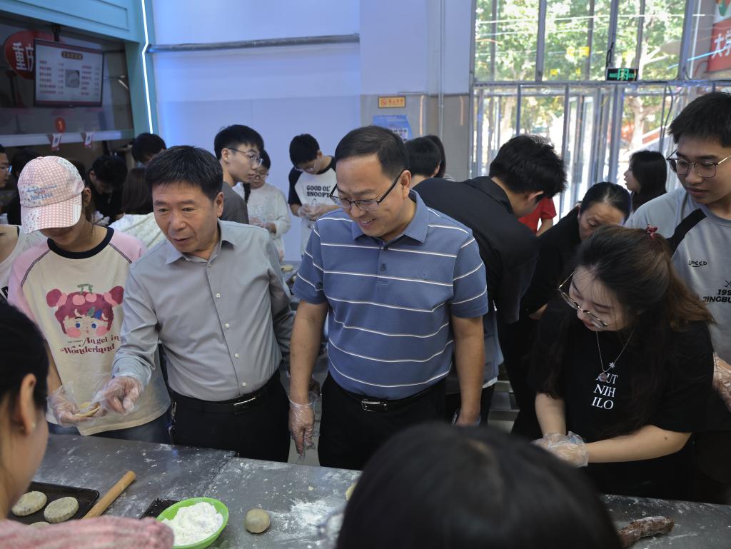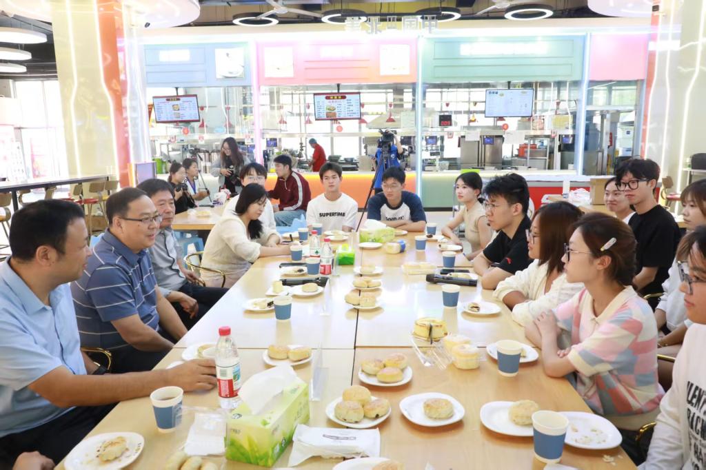 活动中,烘焙师现场演示月饼制作技巧,师生协作完成近 200 块印有校徽、中秋图案的月饼。随着烤好的月饼出炉,“我与书记校长‘面对面’”座谈会同步开启。师生围坐一堂,一边品尝亲手制作的月饼,一边围绕“一站式社区服务优化”“劳动实践课程设计”“校园生活保障”等话题畅所欲言。耿辉建、学生处及后勤服务中心负责人逐一对学生们关心关切的问题进行答复,并鼓励同学们在校园里感受温暖、锤炼本领,将来成为有理想、敢担当、能吃苦、肯奋斗的新时代青年。同时,耿辉建要求学生处、后勤服务中心要合力为学生构建安全、舒适、方便、和谐的学习生活环境。