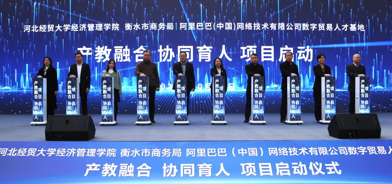 启动仪式上,刘芸为河北经贸大学经济管理学院跨境电商人才培育基地授牌;阿里巴巴国际站与学院签约,并授予“数字贸易人才基地”牌匾。与会嘉宾共同按下启动装置,“产教融合 协同育人”项目正式开启。
