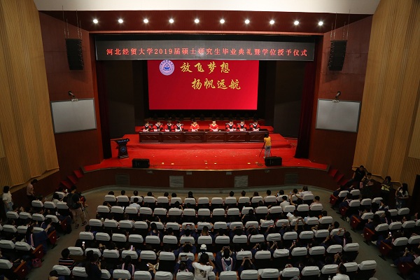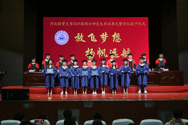 陈亮宣读《河北经贸大学关于表彰2019届省级优秀毕业研究生的决定》。刘建平宣读《河北经贸大学学位评定委员会关于授予2019届硕士研究生硕士学位的决议》。学位授予仪式上,校领导为毕业生一一拨苏正冠,授予证书。