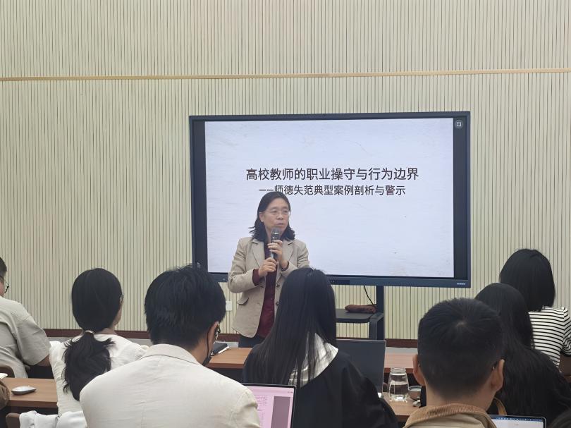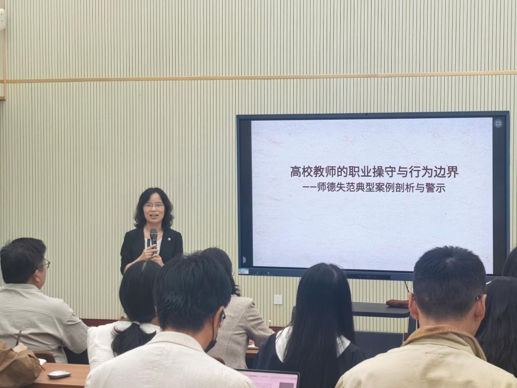 田韶华教授围绕高校教师的职业使命与操守要求,从学术诚信、师生关系、公共言论、职业行为等多个维度深入分析了近年来高校中发生的师德失范典型案例,以此强化教师底线思维,明晰教学科研中的行为准则。她指出,高校教师不仅是知识的传播者,更是学生品格养成的重要引导者,必须时刻以《新时代高校教师职业行为十项准则》为镜,坚守职业底线,明确行为边界。随后,田韶华教授结合实际案例就日常教学科研中如何防范师德风险、处理师生关系等问题进行了阐述,她强调,教师应自觉接受监督,强化责任意识,严格以高校教师“五维道德准则”,即坚守为人品德、恪守业务道德、践行育人道德、严守学术道德、遵守公共道德自我约束,切实做到以德立身、以德立学、以德施教。
