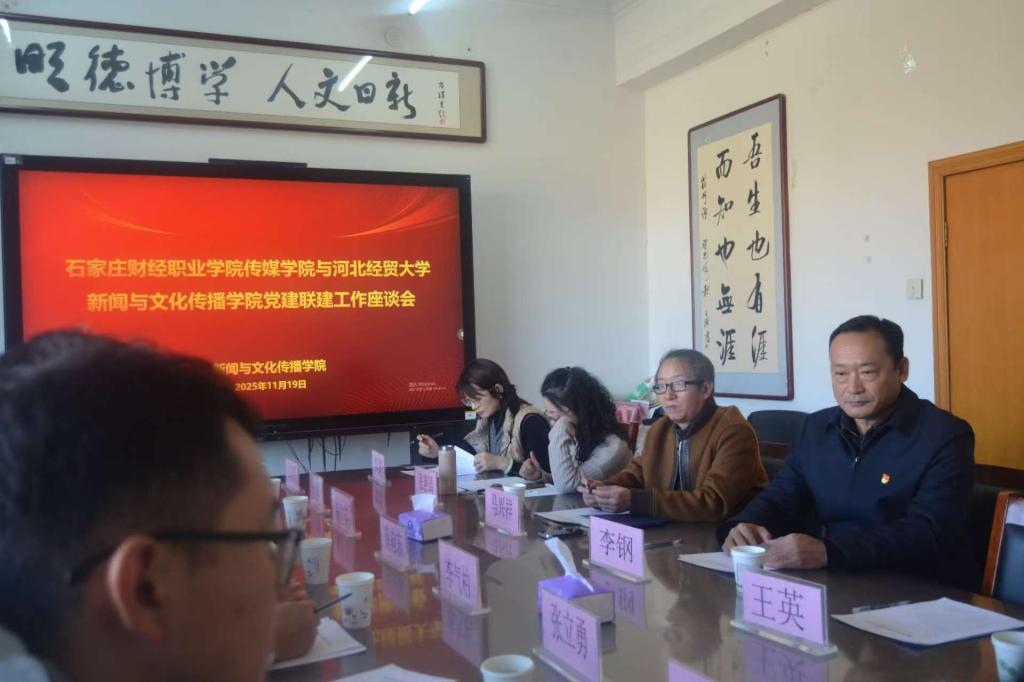 为加快落实河北省高校党建结对帮扶相关部署,深化党建联建工作,实现党建联建与专业建设的深度融合,11月19日上午,石家庄财经职业学院党委书记薛向东、党政办副主任李气柏、传媒学院党总支书记兼院长杨立芬等一行8人来我校新闻与文化传播学院开展交流活动。新闻与文化传播学院党委书记李钢、副院长马兴祥及相关部门负责人、教师代表参会,双方聚焦党建与学科交流,围绕融媒体人才培养、实践教学创新等核心议题展开深入交流。
