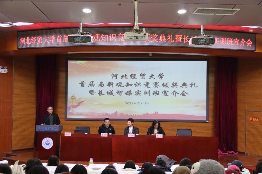 12月18日下午,河北经贸大学首届马克思主义新闻观知识竞赛颁奖典礼暨长城智媒实训班宣介会在国际学术报告厅举办。校党委宣传部部长刘会娟、马克思主义学院院长李英、新闻与文化传播学院院长景义新出席,新闻与文化传播学院副院长马兴祥主持,获奖学生代表及各专业学生共百余人参加。