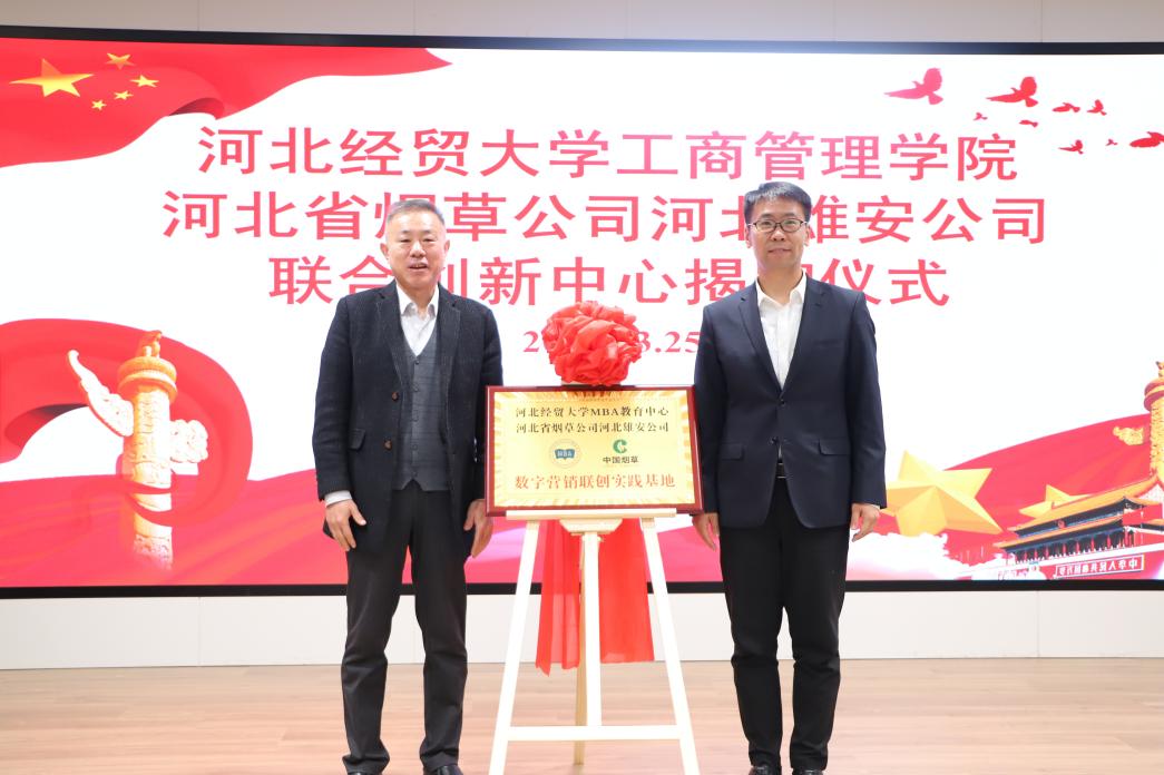 仪式上,双方代表共同签订校企战略合作协议,就联合研发、人才培养、实践应用、成果转化等领域达成深度合作共识。签约仪式上,双方领导为“河北经贸大学工商管理学院河北省烟草公司河北雄安公司产学研联合创新中心”“河北经贸大学MBA教育中心河北省烟草公司河北雄安公司数字营销联创实践基地”揭牌,并围绕人才培训、课程开发、慕课体系建设、企业案例提炼、成果转化等具体合作事宜进行了深入交流。