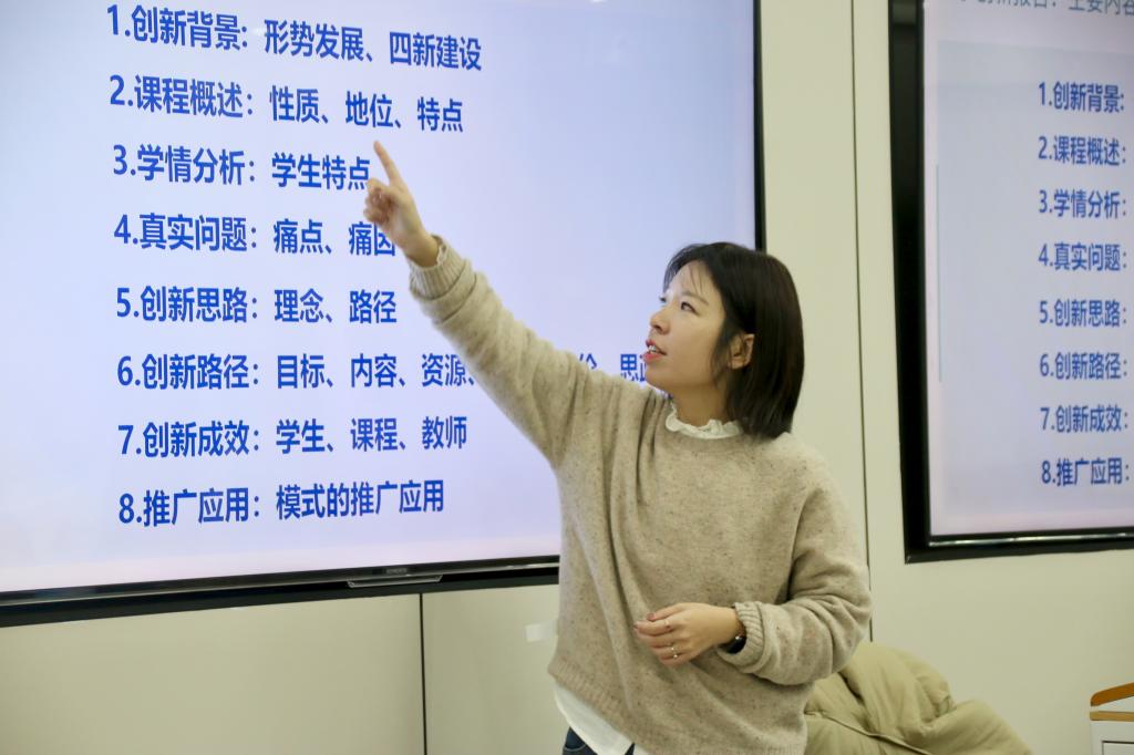 会上,戚成蹊老师从教师教学创新大赛赛事发展历程切入,深度解析大赛核心规则与备赛要领。她结合自身参赛的经验以及以往参赛的经典案例,围绕课堂教学“以学生为中心”的理念问题,重点剖析创新报告的“黄金逻辑”,指出痛点挖掘要聚焦课程专属问题,创新举措需体系化并彰显时代特色,成效验证则必须数据扎实、体现成果辐射。同时,她结合亲身参赛经历,分享了课堂实录的实用技巧。会上,戚老师与学院教师做了进一步的交流,解决了老师们备赛、参赛过程中的一些疑惑。