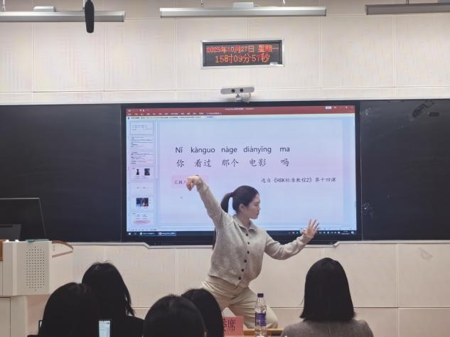 比赛共分为本科生、研究生、留学生三个赛道,说课、讲课、中英文问答、中华才艺展示四个环节。赛前,安兰朋老师进行赛前宣讲,全体参赛人员合影留念。之后,各参赛人员依照分组有序进入教室准备比赛,展现不同风格的中文教育课堂。