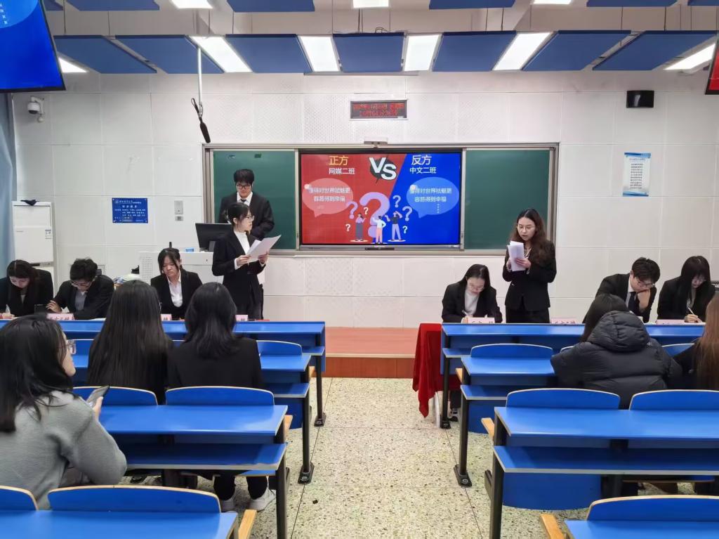11月9日下午,新闻与文化传播学院“青春思辨季,与你共争锋”班级辩论赛决赛于北三教B103举行,进入决赛的25级中文二班与25级网媒二班两支队伍围绕“懂得对世界赋魅/祛魅更容易得到幸福”辩题,展开了精彩激烈的辩论。