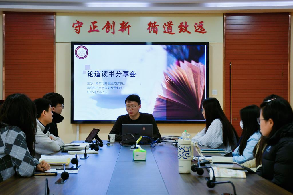 12月5日,马克思主义学院在二办203举办研究生“论道”读书分享会(第五期),本次会议由青年马克思主义研习社、学院第五党支部主办。学院青年教师、硕士研究生导师梁若愚作为评议人,2025级中国近现代史基本问题研究方向全体研究生参与学习交流。