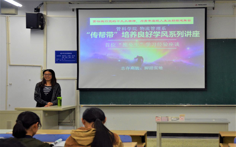 11月6日晚7点半,管理科学与工程学院于A204教室举行“传帮带”培养良好学风讲座。此次讲座由2014级物流管理专业张雨萌主讲,宋智广老师和17级物流管理专业新生参加。