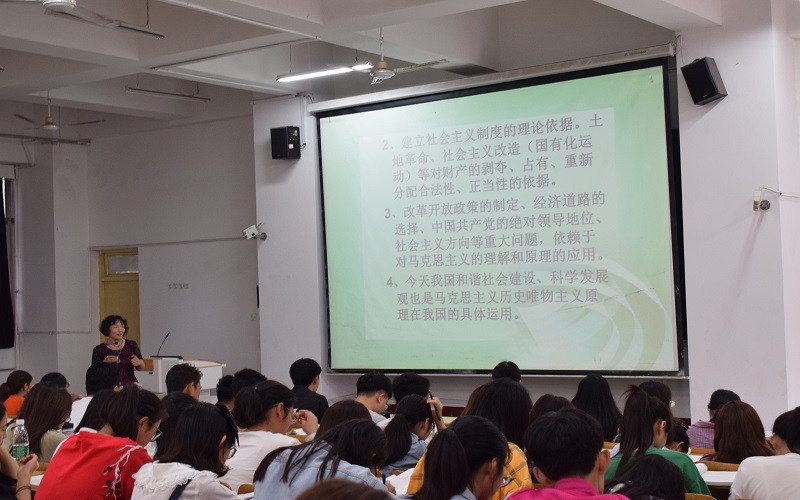 马克思这位全世界无产阶级的伟大导师为我们留下了巨大的精神财富,马克思主义理论内容庞大且复杂,想要讲好这门课并让每个同学都能理解马克思主义理论其实并不容易。所以老师上课前做了大量准备,制作ppt、找相关资料、各个环节内容的衔接都精心设置以便有规律、深入浅出的讲授。而课堂上也多种方法并用,学生讲述、讨论、归纳,穿插多个现实例子,放视频等,用通俗易懂的语言,帮助学生深入理解,通过学生喜闻乐见的方式,注意发挥学生的主观能动性。在学生无法流畅回答问题的时候,老师一步步的引导着学生分析,希望学生能大胆设想,加强学生的记忆与理解。在谈到如何引导学生理解复杂的马克思主义思想时,老师说关键是绝不能空谈理论,要把看起来高大上的理论落到实处,尤其是与中国的实际情况相结合,与习近平新时代中国特色社会主义思想相结合,用理论去说明问题、解决问题,立足生活,让每个学生都能直观的理解,增强理论的说服力。